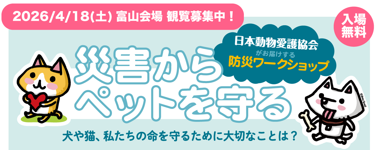 公益財団法人日本動物愛護協会(以下「当協会」といいます)は、「防災ワークショップ 災害からペットを守る」にご応募(以下「本応募」といいます)いただくにあたり、応募者の個人情報を含む利用者情報を取得・利用させていただきます。当協会は、利用者情報の適正な保護のため、個人情報保護法および下記の方針のもと、利用者情報を適法かつ適正に取り扱います。